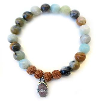 This Believe stackable bracelet is made with Mixed Amazonite gemstone beads (8mm) and Rudraksha seeds and embellished with the word charm, 'Believe'.