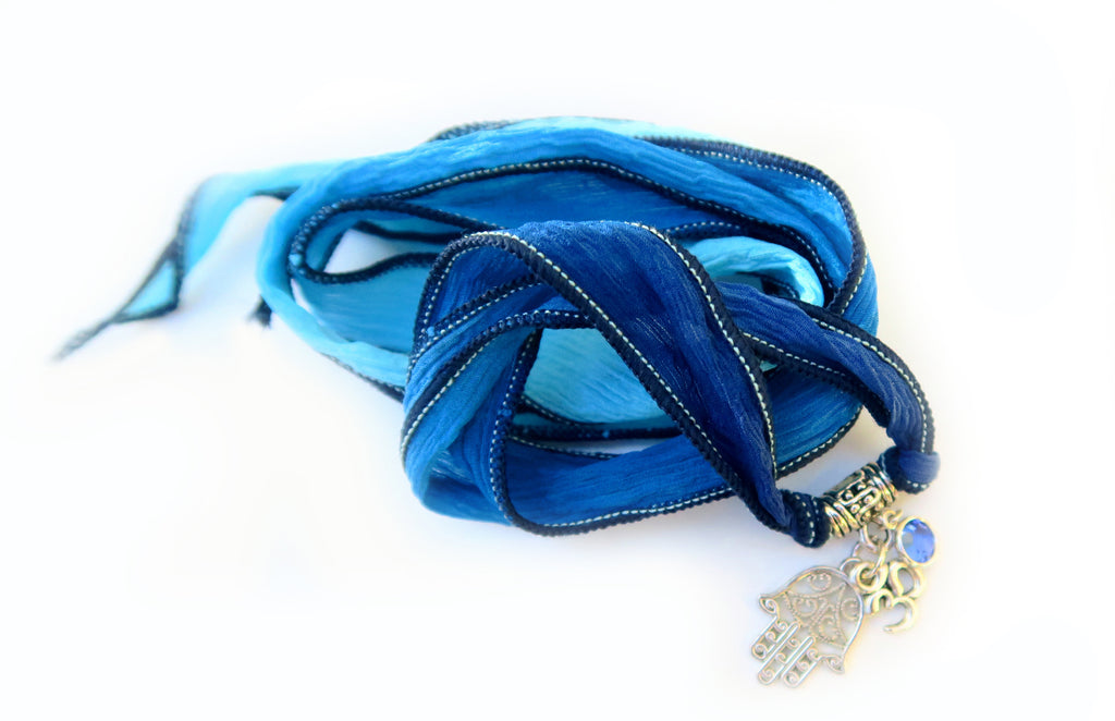 This Once in a Bluest Moon Yoga Silk Wrap is made with a shades of blue hand dyed silk ribbon that has been embellished with a silvertone charm carrier holding a sterling silver and cornflower blue Swarovski crystal charm, a hamsa and an Om charm.