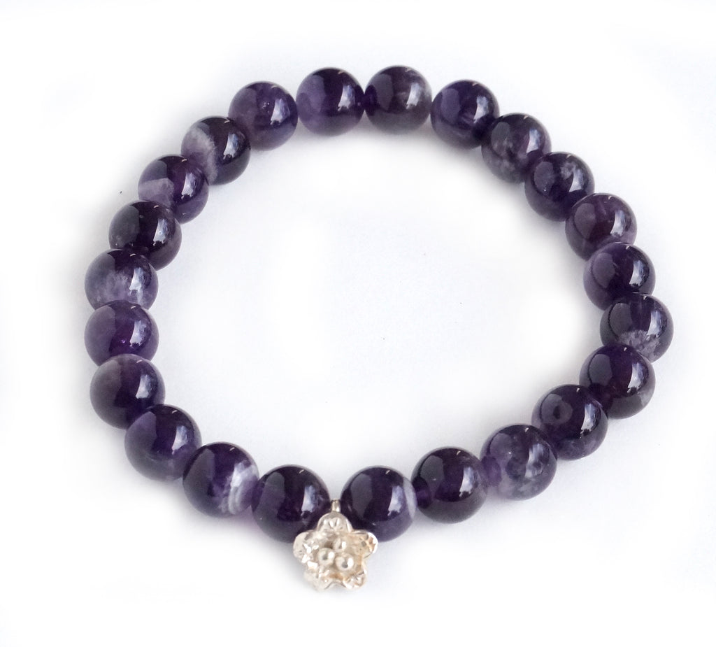This Shining Lotus bracelet is made with Amethyst beads and a sterling silver Lotus.