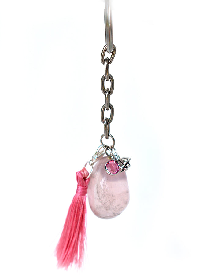 This key ring is made with a delicate Rose Quartz gemstone adorned with a sterling silver Swarovski rose crystal charm, a lotus bud charm and a detachable handmade pink colored tassel