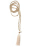 This Gentle Dusk Fashion Mala is a mala inspired necklace made with 4mm faceted man-made fawn colored crystals strung with gold seed beads. It is finished with an ecru colored tassel that has been embellished with a gold plated Swarovski clear crystal charm.