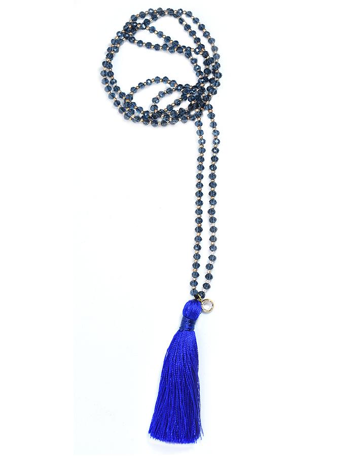 This Midnight Stars Fashion Mala is a mala inspired necklace made with 4mm faceted man-made smoky blue colored crystals strung with gold seed beads. It is finished with cobalt blue colored tassel that has been embellished with a gold plated Swarovski clear crystal charm.